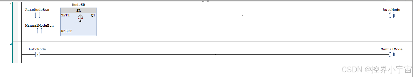 设备模式选择(自动/手动)需要「模式切换后保持状态,且自动模式优先」,结合SR触发器的优先级特性和单一置复位指令的简洁性实现: