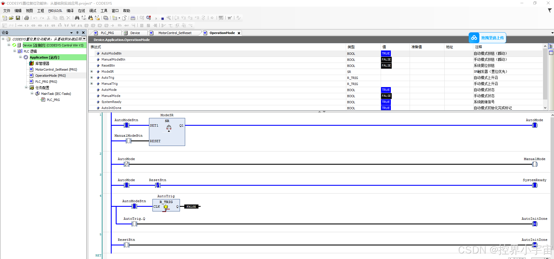 案例2:设备运行模式选择(SR触发器 + 单一置复位指令)