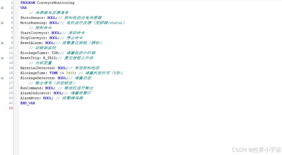 工业传送带的堵塞检测需要「持续检测物料滞留,触发报警后锁定状态,需手动复位」,用单一置复位指令替代RS触发器,实现更灵活的报警逻辑: