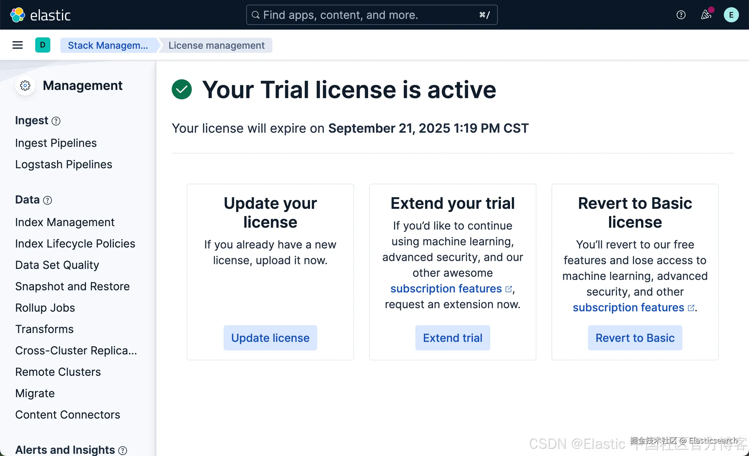 我们需要使用到内置的 ELSER 模型来向量化我们的数据。我们需要启动白金试用: