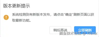 那在开发过程中很容易遇到过这种问题,当我把前端写好的新版本的代码进行打包上传,这个动作已经进行了版本更新了,但是用户在访问旧版本网页时如果没有点击刷新,根本不知道已经上新了新版本,而且如果新版本已经取消了某个功能,但用户用旧版本进行提交必然会出错