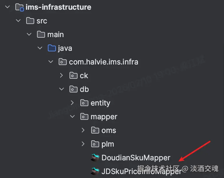 3.Mapper接口文件的文件夹路径如下,所以targetPackage路径写的是Mapper接口文件的具体文件夹路径,targetProject写到java层即可: