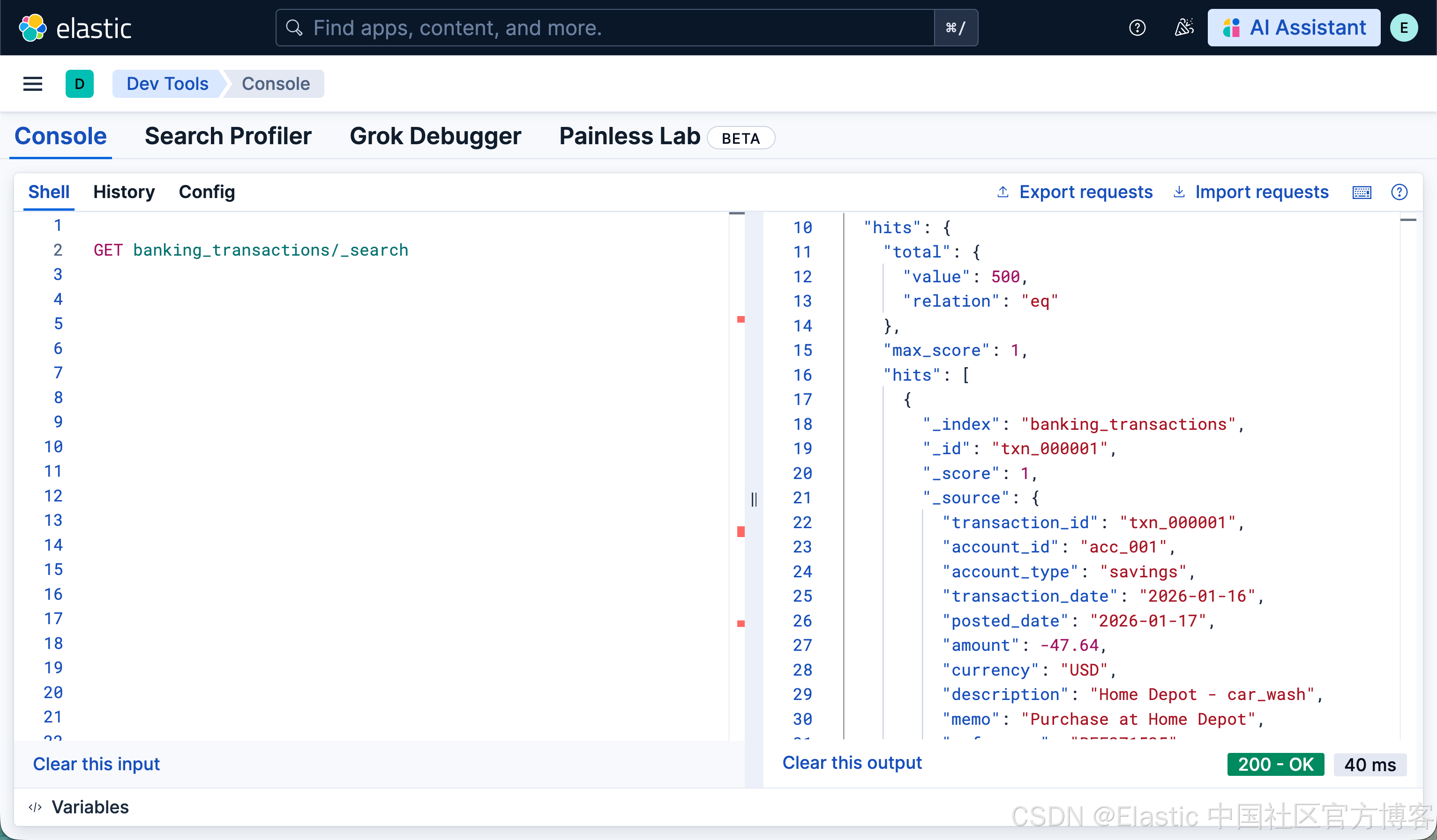我们可以看到有 500 个交易记录。其中的一个交易记录如下: