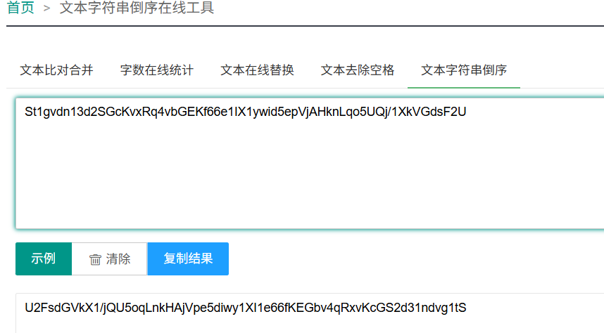 在这里发现一段编码。根据最后面几个字符反过来是U2Fsd(为AES加盐加密)和题目名字为倒置的猜测应该要倒置这段编码并解密,密码为上面得到的密码。