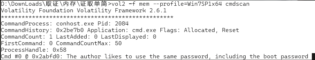 vol2 -f mem --profile=Win7SP1x64 cmdscan