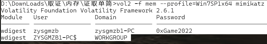 vol2 -f mem --profile=Win7SP1x64 mimikatz