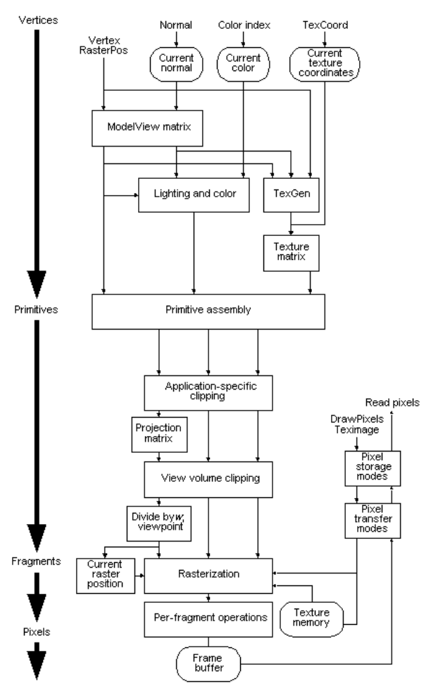 per-fragment operations 包含条件更新到framebuffer基于收入和之前存储的Zvalues(for z-buffering)和blending的存储颜色的输入像素点颜色,如同像素值的masking和其他逻辑操作