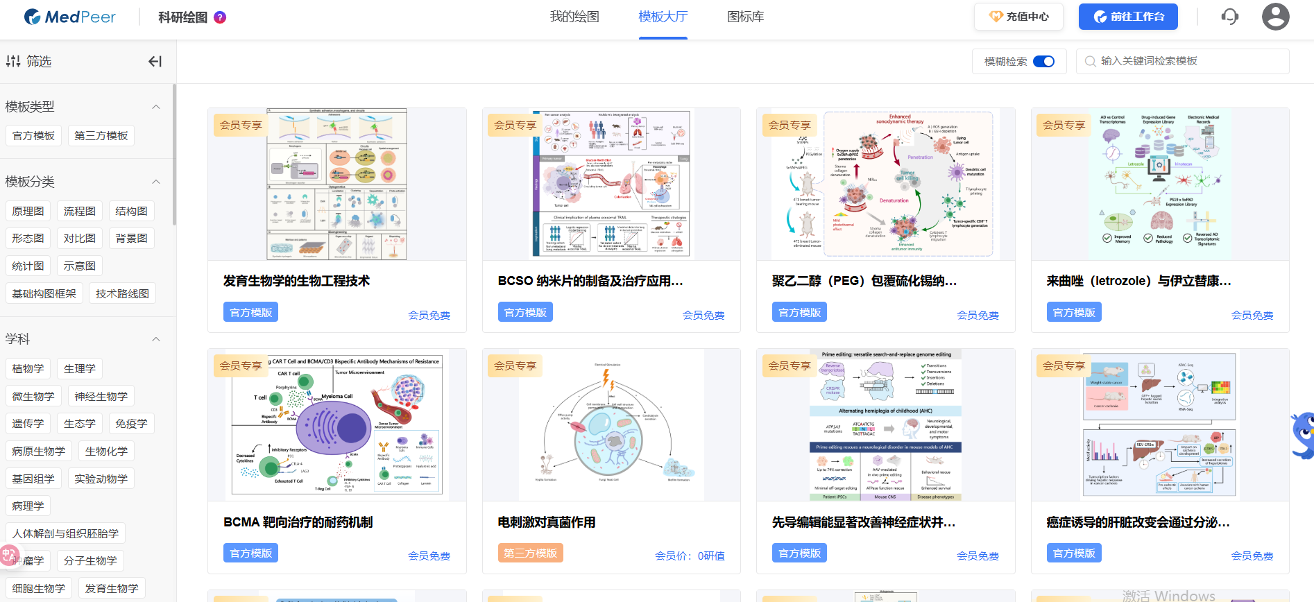 MedPeer提供了超过10万+的原创矢量图标 ,涵盖了30余种生物医学学科。这意味着,无论你是做分子生物学机制研究,还是细胞生物学、病理学分析,你都能在素材库中找到高精度的细胞器、蛋白、实验器材等矢量素材。这些图标风格统一,精美专业,支持自定义配色,直接拖拽即可使用,彻底告别"手残党"的烦恼。