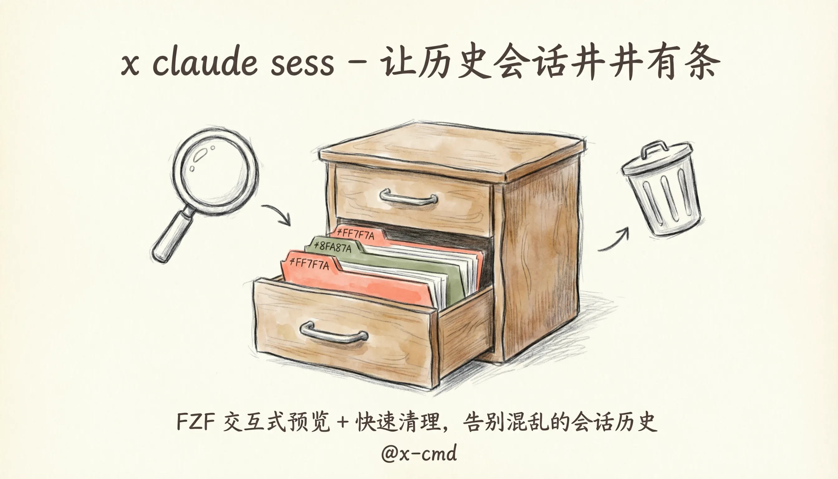 画面中心是一个手绘风格的文件柜,抽屉半开,里面整齐排列着带标签的文件夹(代表会话)。文件柜上方漂浮着一个放大镜图标(代表 FZF 搜索)和一个垃圾桶图标(代表清理功能)。背景是柔和的米白色 #F9F7F2,整体采用温暖的手绘插画风格,线条自然流畅。文件夹用柔和的珊瑚红 #FF7F7F 和鼠尾草绿 #8FA87A 点缀。