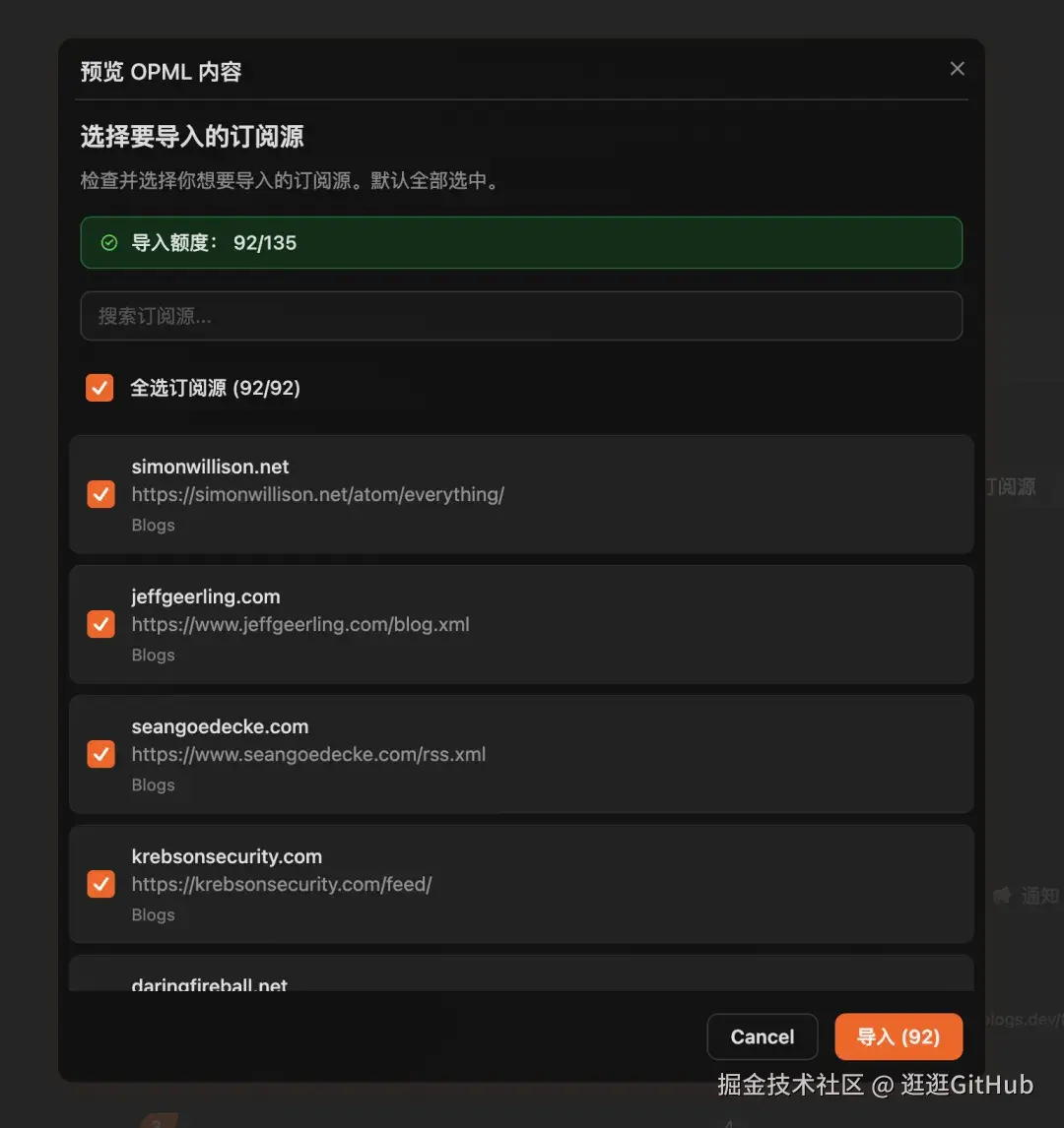 ③ 导入 opml 文件下载之后,只需要导入刚刚下载的 opml 文件就行了。