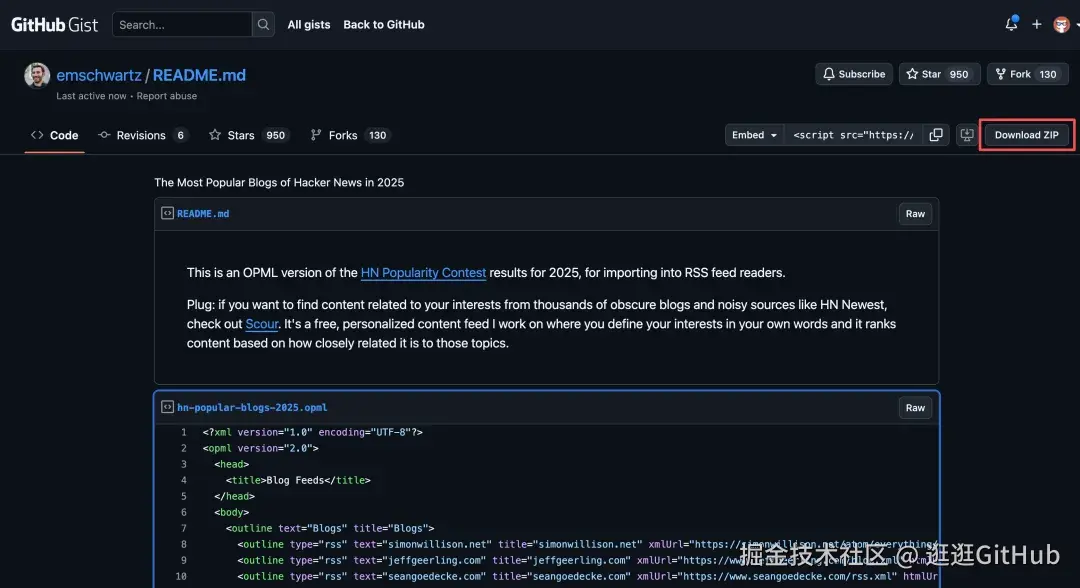 地址:https://gist.github.com/emschwartz/e6d2bf860ccc367fe37ff953ba6de66b#file-hn-popular-blogs-2025-opml