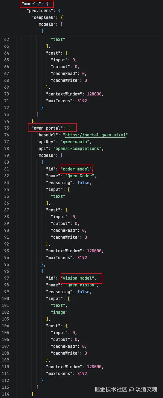 我这边引入了Deepseek和系统自带的qwen-portal模型,其中qwen-portal的APIKey可以看到认证方式是通过qwen-oauth,然后我们可以在后面添加我们所需的qwen3模型,配置内容可以与我下方一致,只需将apiKey更换成阿里百炼中自己的ApiKey即可。