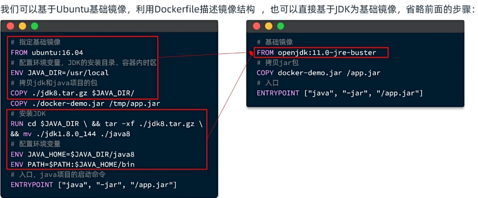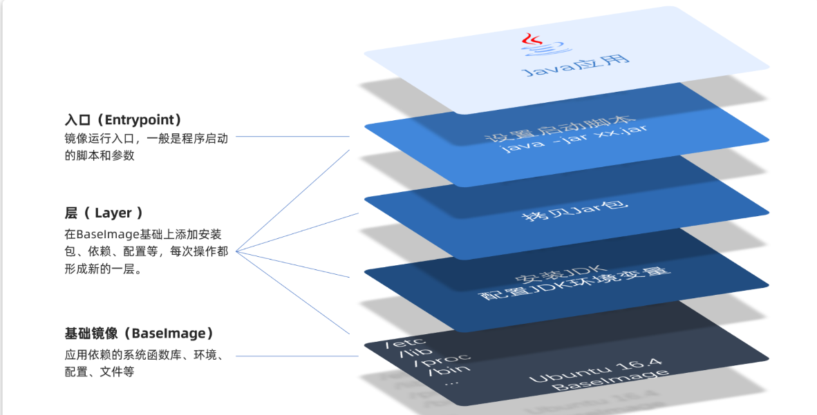以后我们会有很多很多java项目需要打包为镜像,他们都需要Linux系统环境、JDK环境这两层,只有上面的3层不同(因为jar包不同)。如果每次制作java镜像都重复制作前两层镜像,是不是很麻烦。