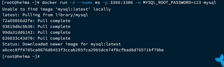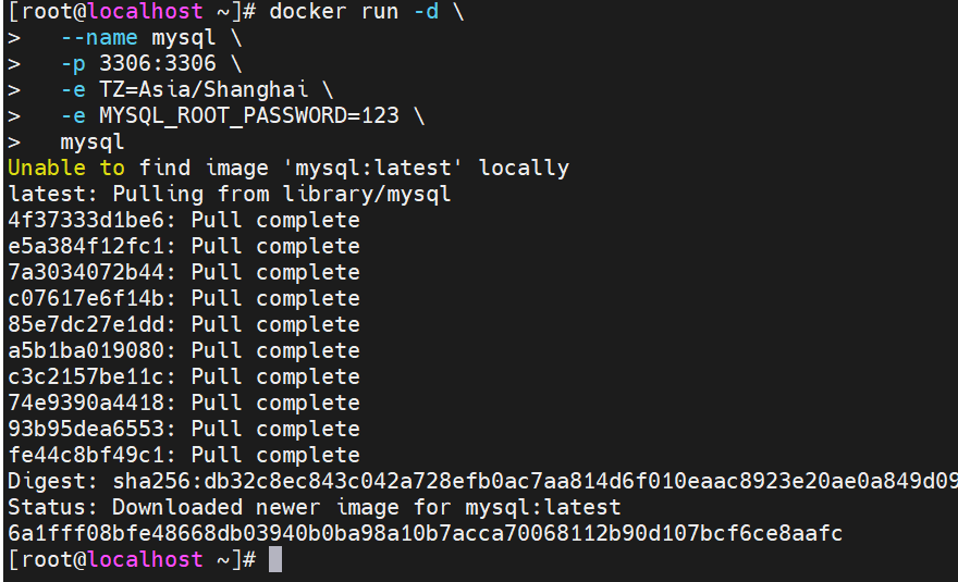 docker run -d \ --name mysql \ -p 3306:3306 \ -e TZ=Asia/Shanghai \ -e MYSQL_ROOT_PASSWORD=123 \ mysql