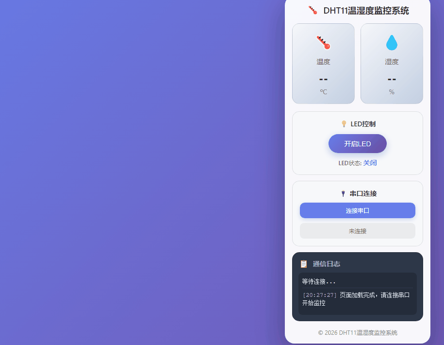 请创建一个上位机HTML串口通信控制界面:1.实时显示接收的温湿度数据,温湿度配适当的icon;2.一个Toggle按钮,点击发送LED0或LED1控制下位机灯的亮灭。