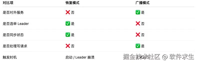 很多人面试时会漏掉这一点。Zab 不是从头到尾一个模式,而是两个阶段切换的协议。