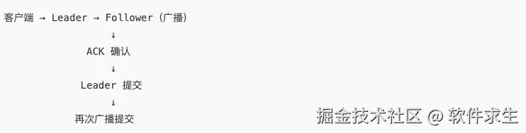 一句话:所有写请求,都由 Leader 发起原子广播。