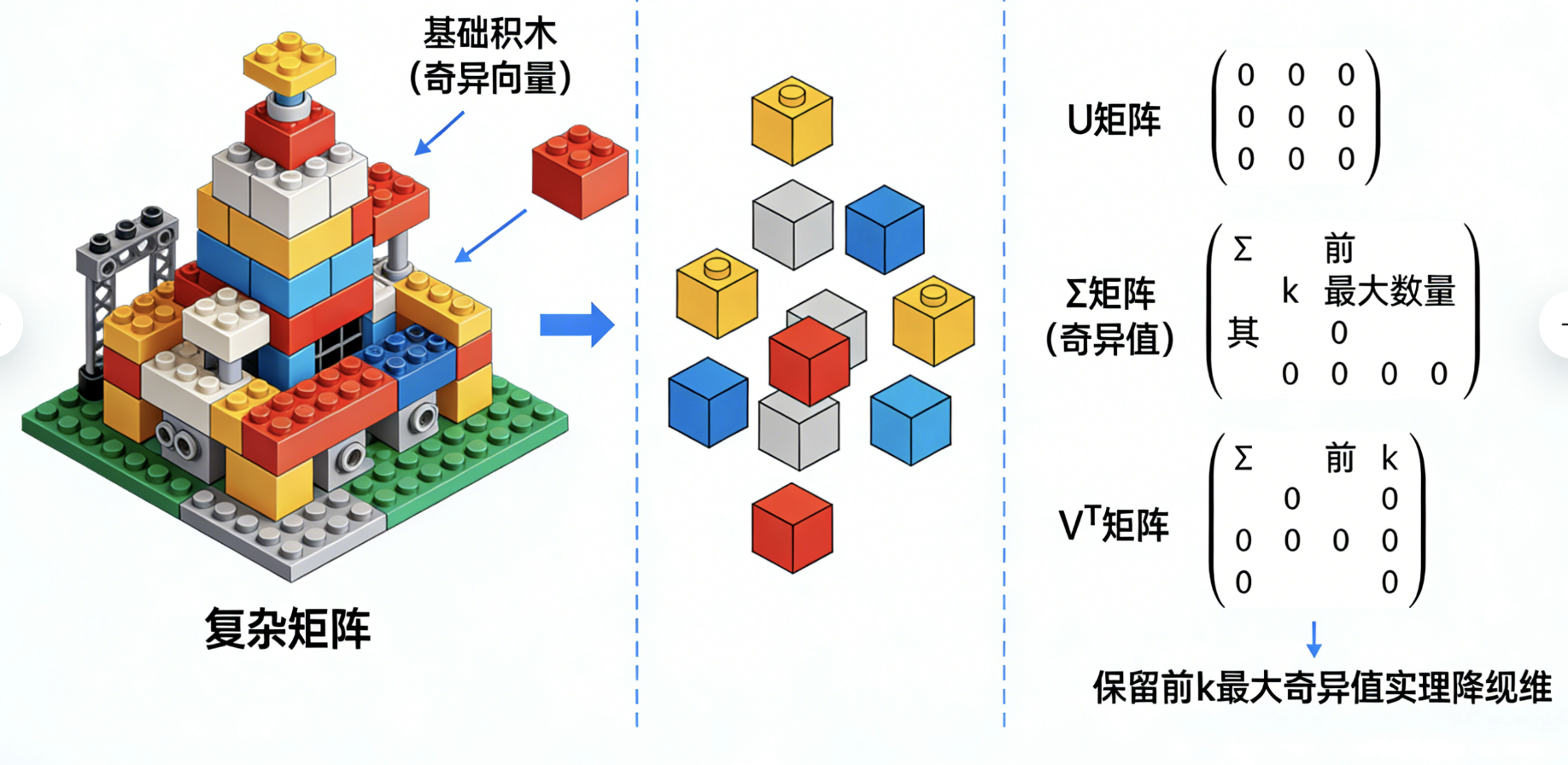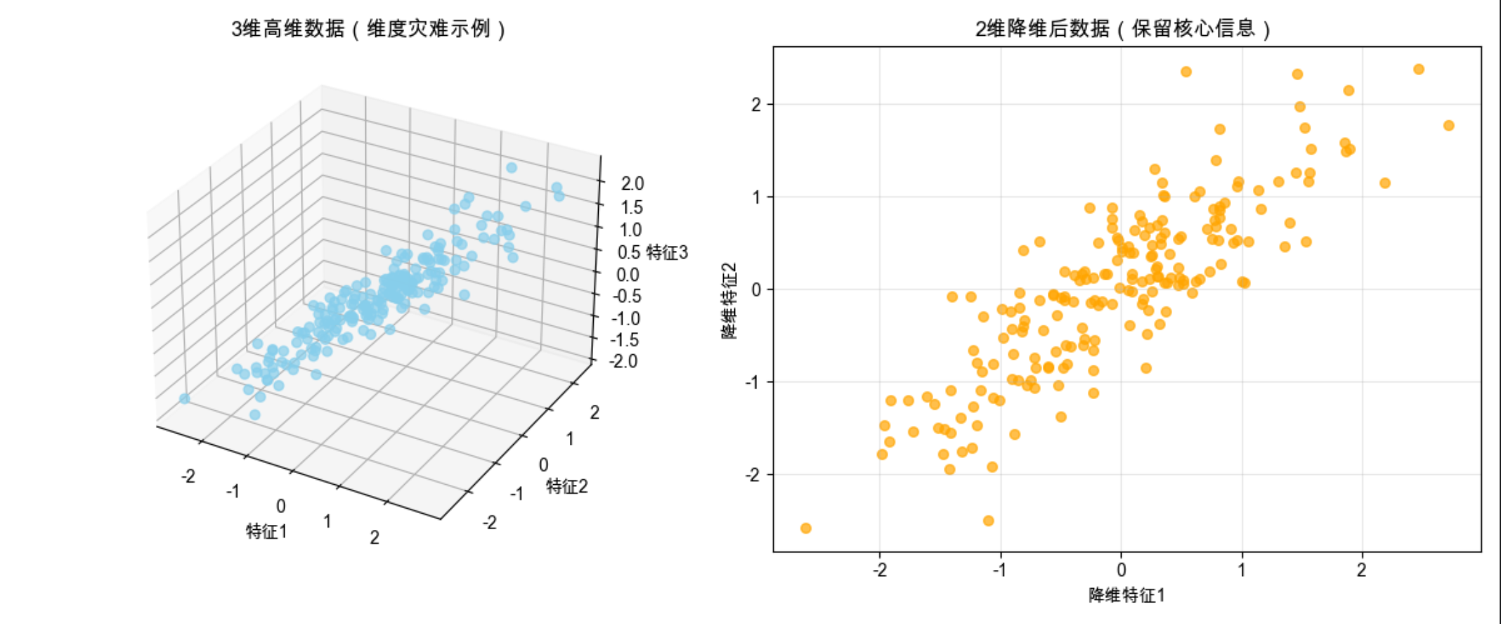 左侧是杂乱的 3 维数据,右侧是降维后保留核心规律的 2 维数据,直观体现降维的价值。