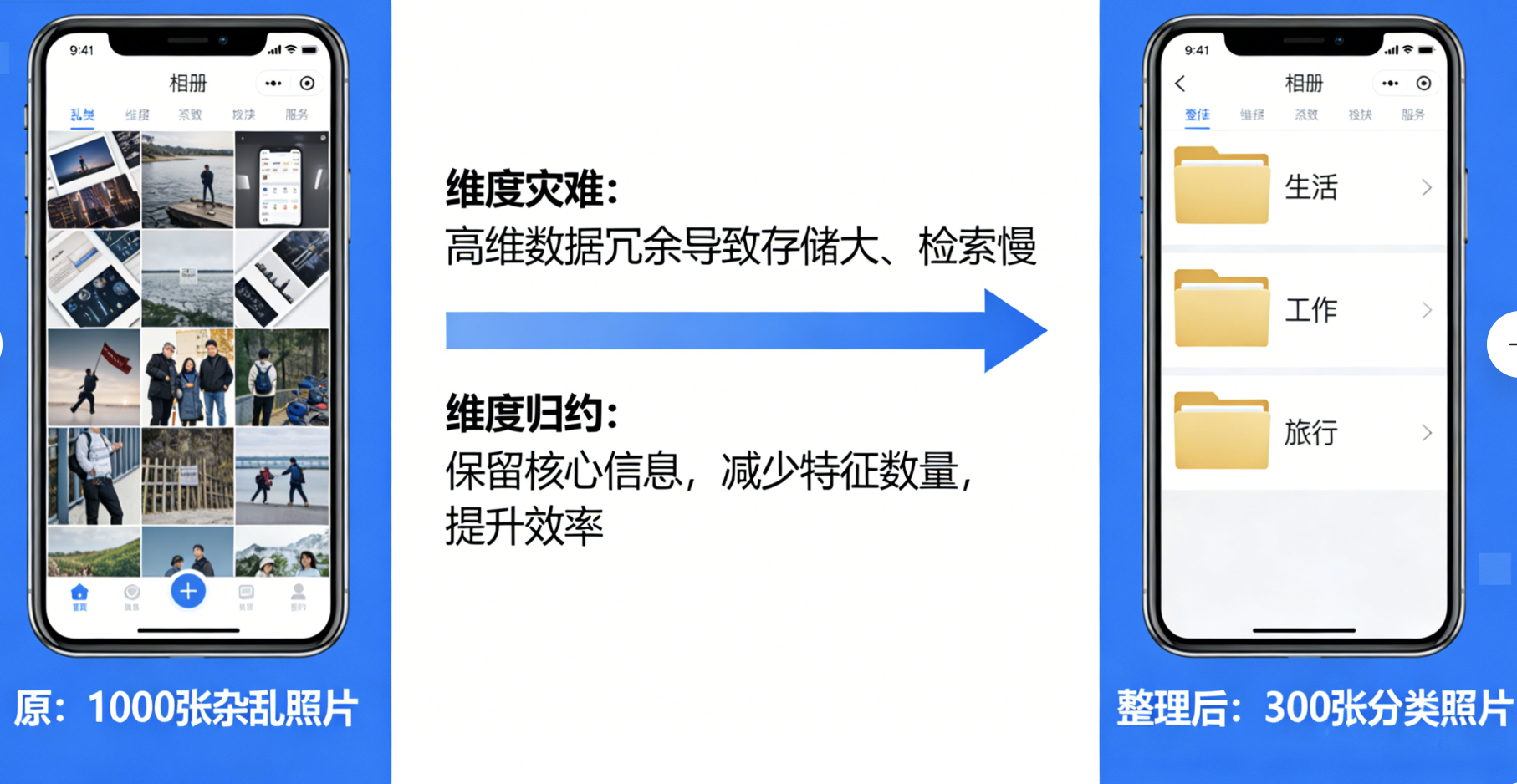 维度归约(降维)就像给你的手机相册做整理:原本几千张杂乱的照片(高维数据),你按 "生活 / 工作 / 旅行" 分类后(低维表示),不仅占用空间变小,找照片也更快了。
