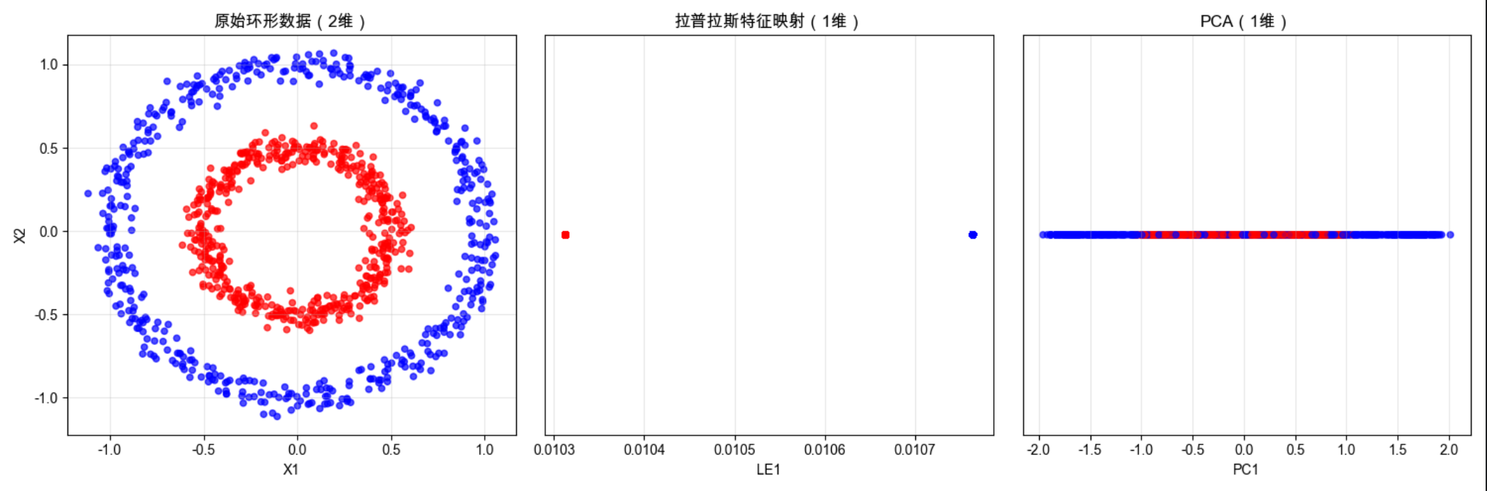 - 用环形数据集演示拉普拉斯特征映射的非线性降维能力