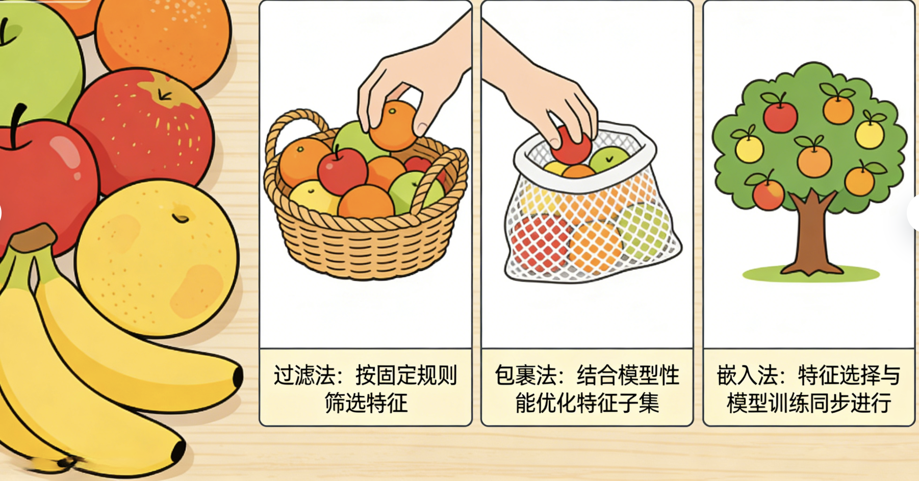 子集选择就像选水果:从一堆水果(所有特征)里,挑出最甜、最新鲜的几个(关键特征),扔掉不新鲜的(冗余 / 噪音特征)。