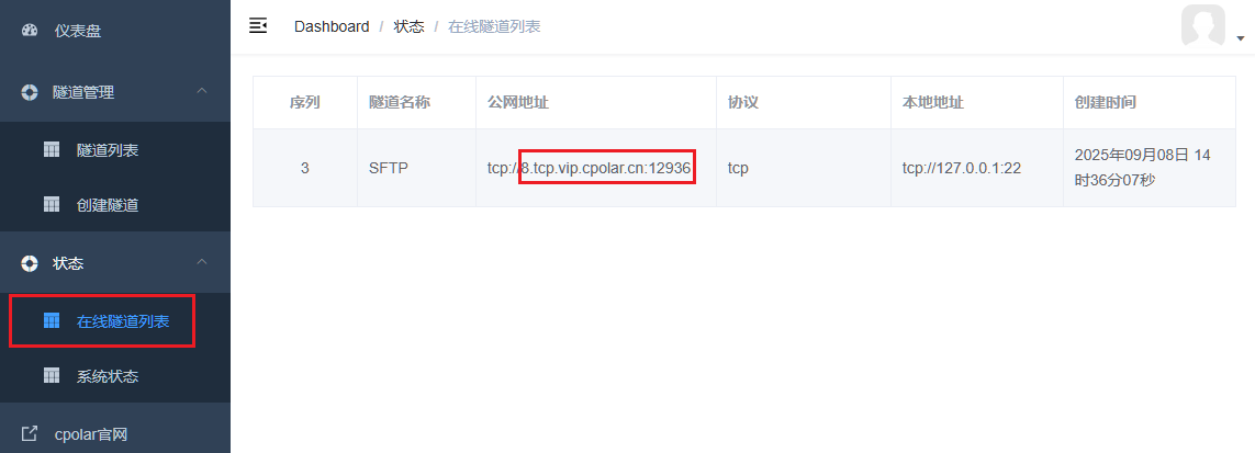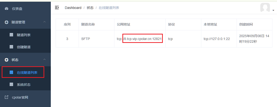 然后打开左侧在线隧道列表,查看刚刚创建隧道后生成的远程 TCP连接地址,这个地址就是远程连接的地址,在其他设备上的SFTP客户端,输入这个地址即可连接,下面进行连接测试