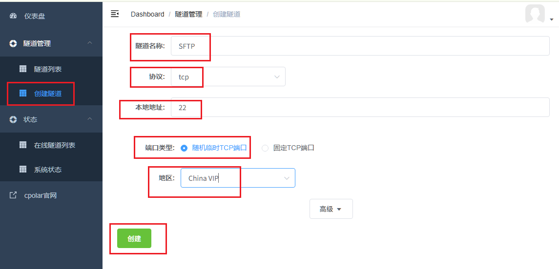 - 隧道名称:可自定义,注意不要与已有的隧道名称重复