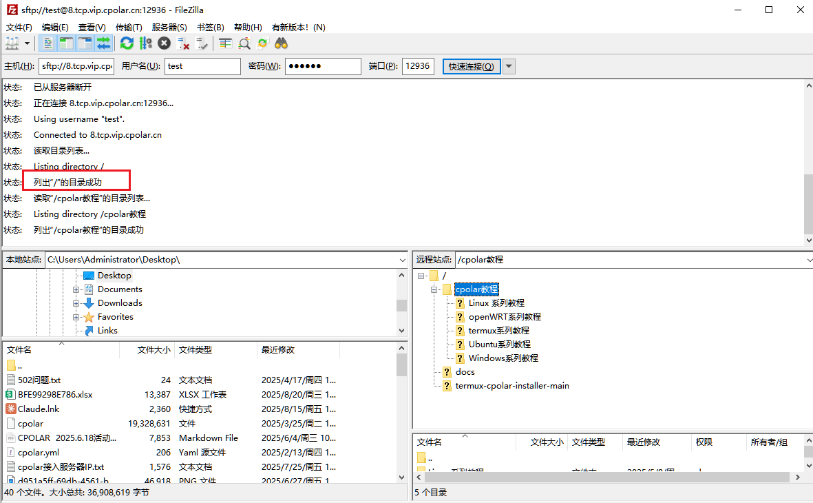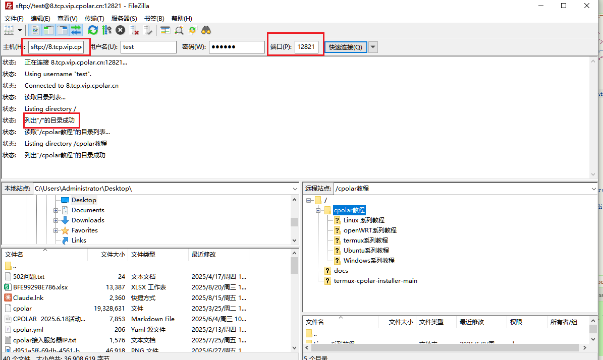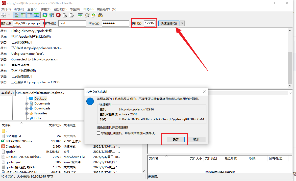 本例使用的连接端的filezilla, 主机名称填写: sftp://8.tcp.vip.cpolar.cn(⚠️注意不能漏掉sftp://协议名称),端口填写地址后面的五位数端口 再点击连接即可,如果出现弹框,点击接受, 然后可以看到 连接成功了,简单几部实现了远程连接本地Serv -U 文件服务
