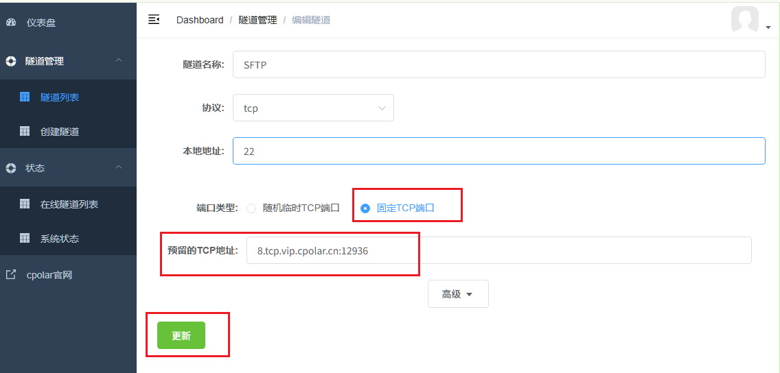修改隧道信息,将保留成功的固定tcp地址配置到隧道中