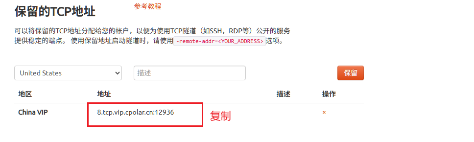 上面步骤在cpolar中使用的是随机临时tcp端口地址,所生成的公网地址为随机临时地址,该公网地址24小时内会随机变化为了方便使用,我们接下来为其配置固定的TCP端口地址,该地址不会变化,设置后将无需每天重复修改地址。