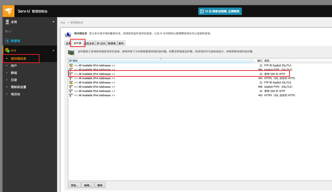 打开我们创建域里面的详细信息---监听器列表可以看到,是默认开启SFTP监听器,端口是 22端口,接下来我们就是通过SFTP连接,方便 快捷.