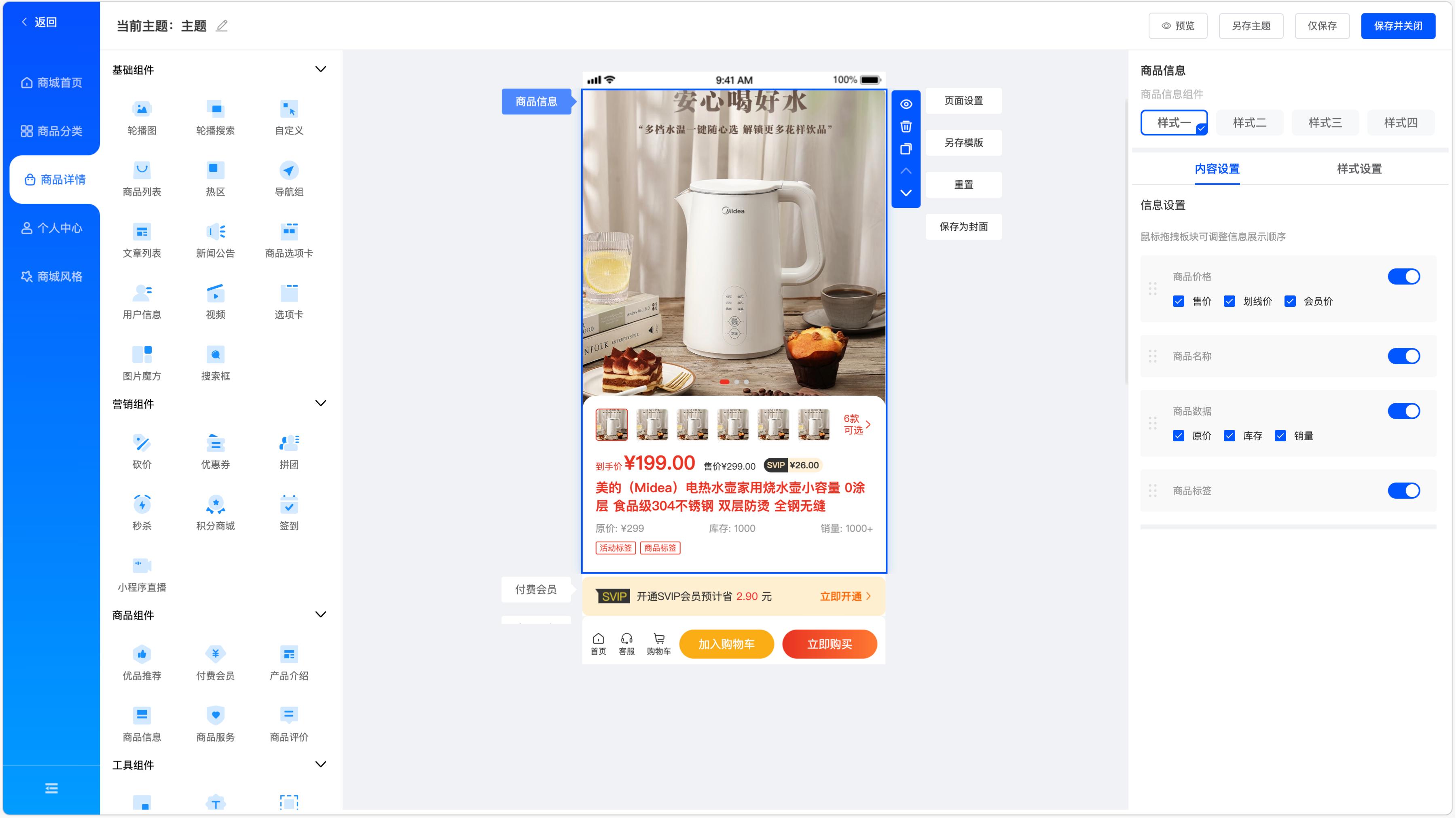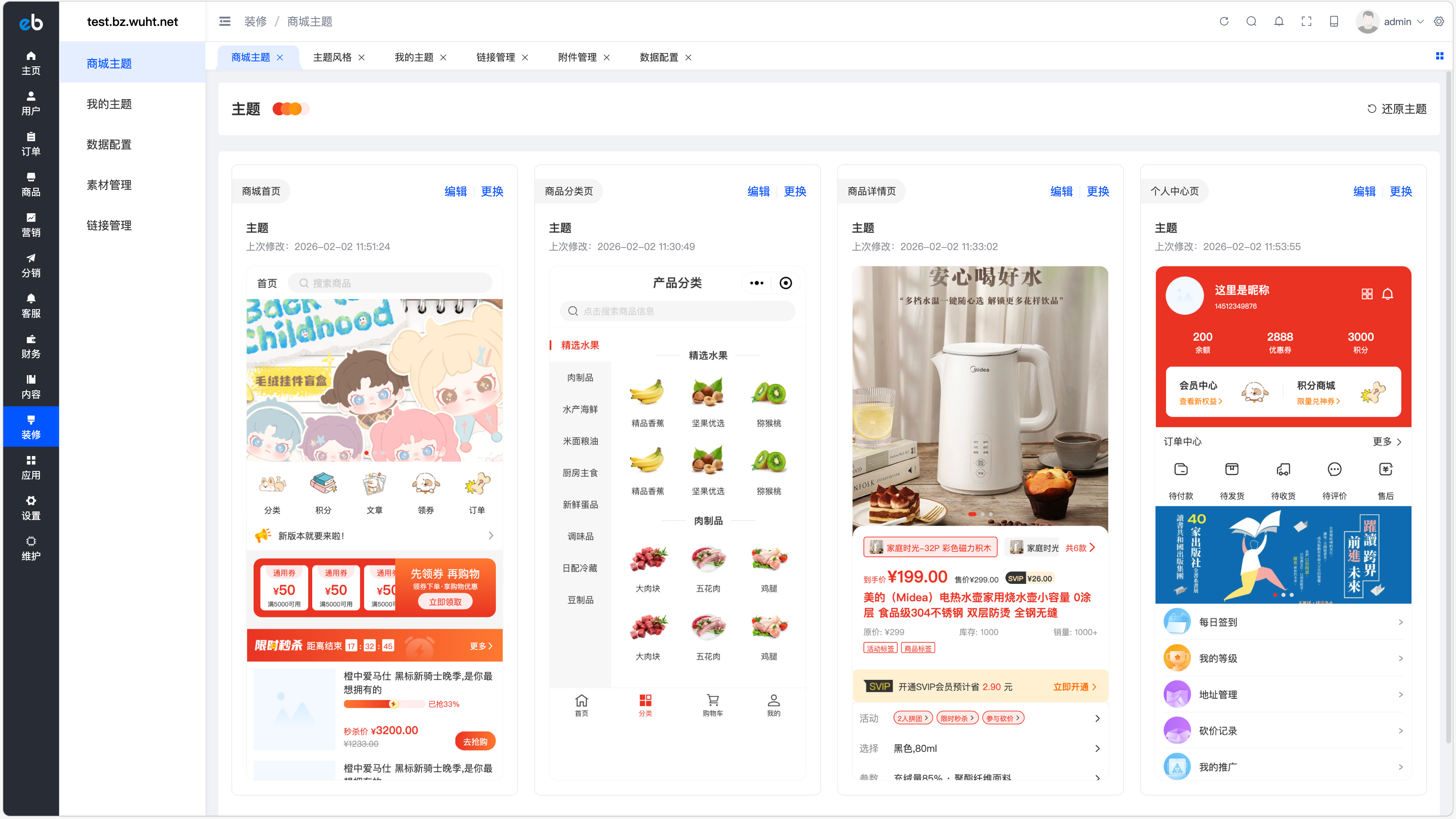 全新商城主题功能,为商城搭建与运营提供了高度灵活的模版化配置能力。让商城的页面不再受限于单一模版,可轻松实现商城首页、商品详情页、个人中心页面的DIY个性化装修。