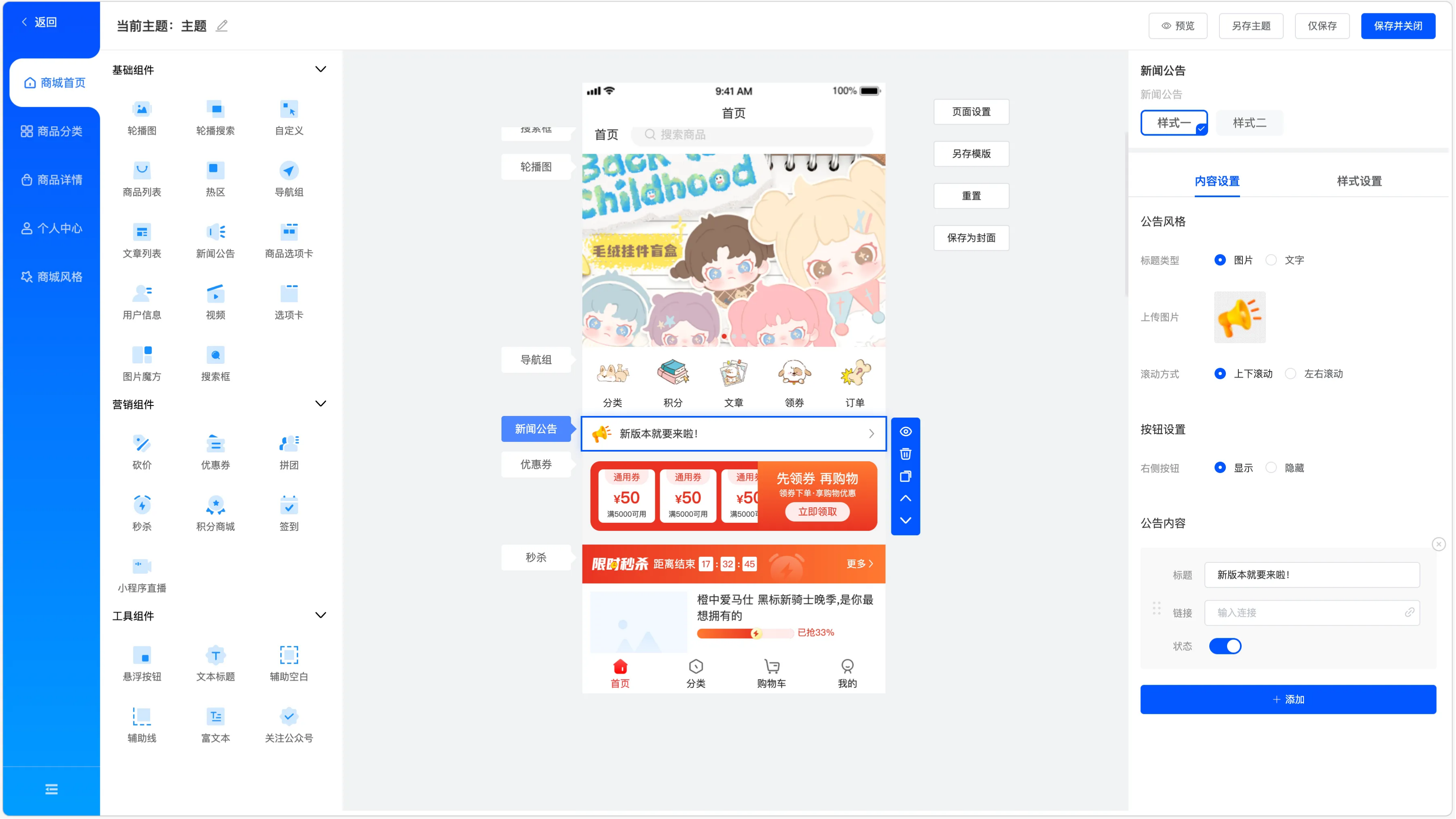 春节用红色调,春天换清新风?商城主题风格自定义设计,支持自由设置主题风格色系,还支持风格库管理。无论是品牌大促、节日活动还是日常运营,都能轻松匹配合适的商城主题颜色风格,让你的商城永远鲜活在用户眼中。