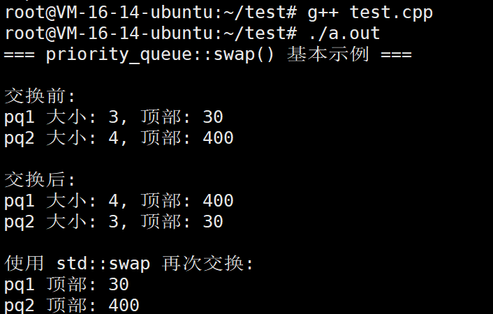std::cout << "=== priority_queue::swap() 基本示例 ===\n" << std::endl;