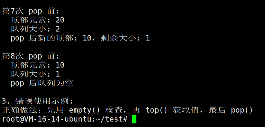 // int value = emptyQueue.pop(); // 错误!pop() 不返回值