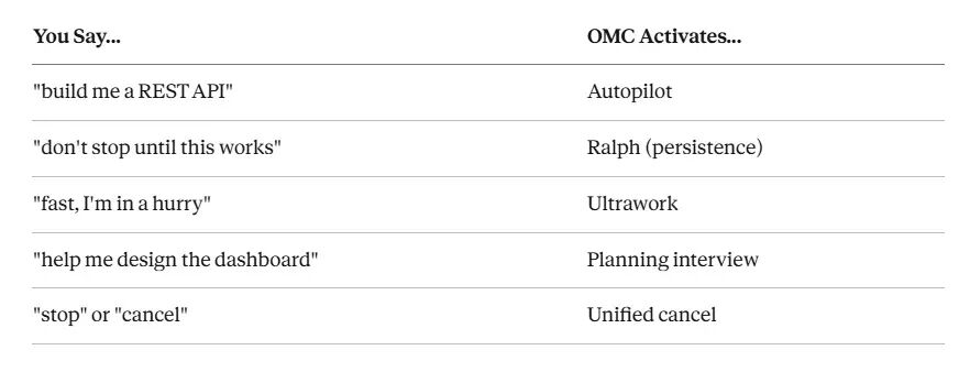 默认情况下,你只要用自然语言说事,OMC 就能判断该用什么模式、哪个智能体。