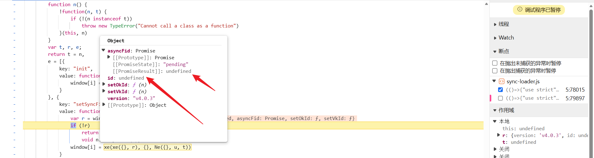 从 /fp/?id= 堆栈跟到 sync-loader.js 文件中,在 return e(r(t(n))); 处下断点,走的异步流程,刷新网页断住后单步往下跟,跟到下图处就会发现熟悉的 window.rb_sync,此时 id 的值还是 undefined: