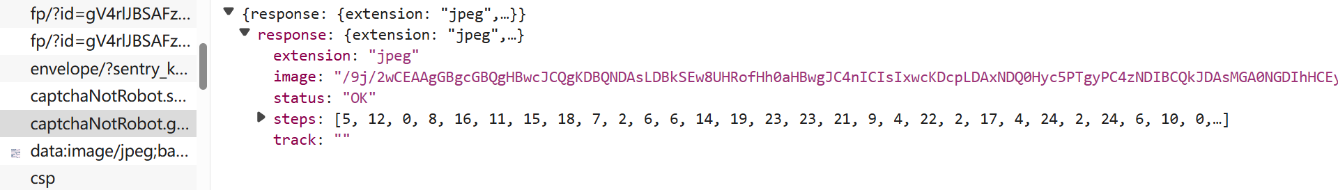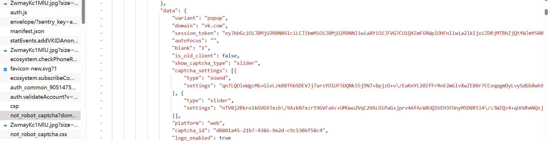 not_robot_captcha 接口的响应内容中,show_captcha_type 为触发的验证码类型,滑动拼图为 slider,一点即过的为 checkbox,可以此区分触发的类型,captcha_settings 中的参数会用于后续获取图片的接口,其余部分后文分析: