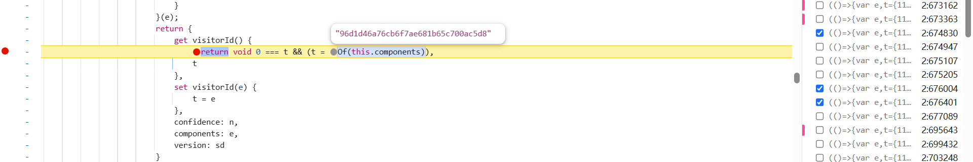 这里就不单步慢慢跟了,搜索 analyticsModel.fingerprint 定位到下图处,t.visitorId 就是目标值: