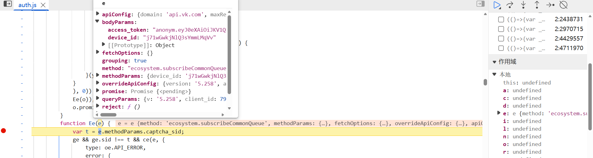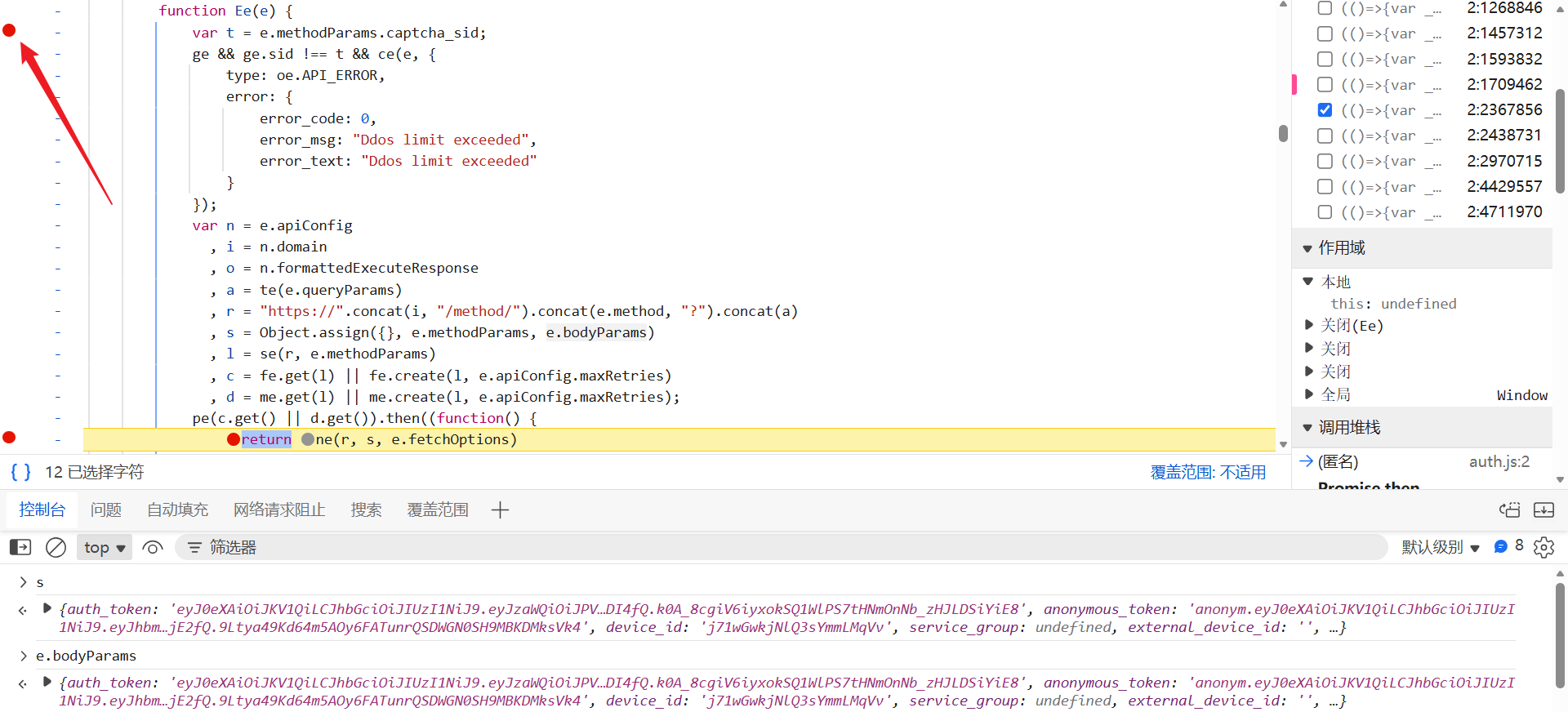 从 auth.validateAccount 接口跟栈到 auth.js 文件中,直接搜索 device_id 会发现有 100 个匹配项,一个个下断调试显然不现实。跟栈到下图处,此时的 s 中 device_id 已经生成了,s 对应 e.bodyParams,e 是传进来的参数,因此,在最前面下断: