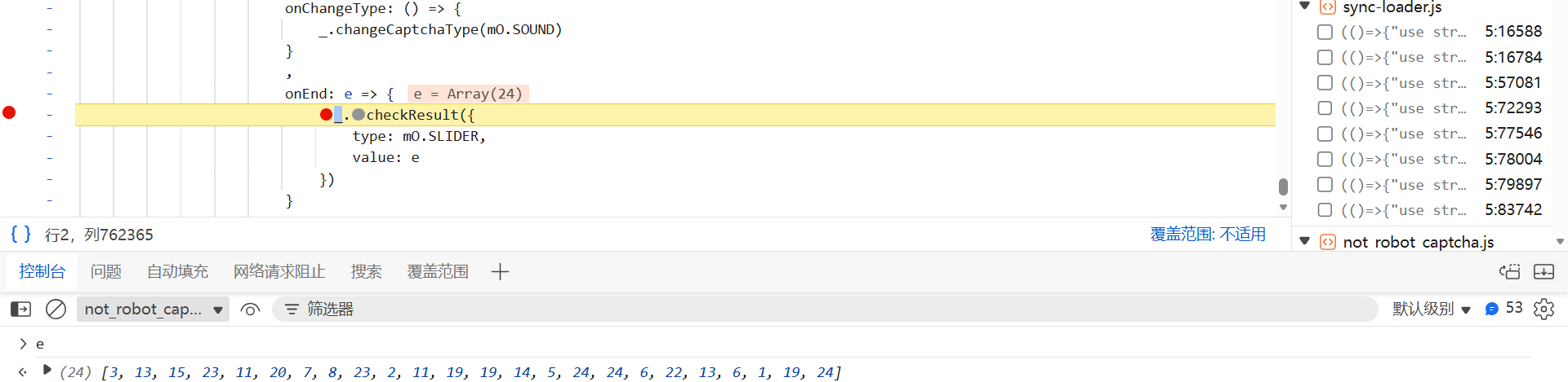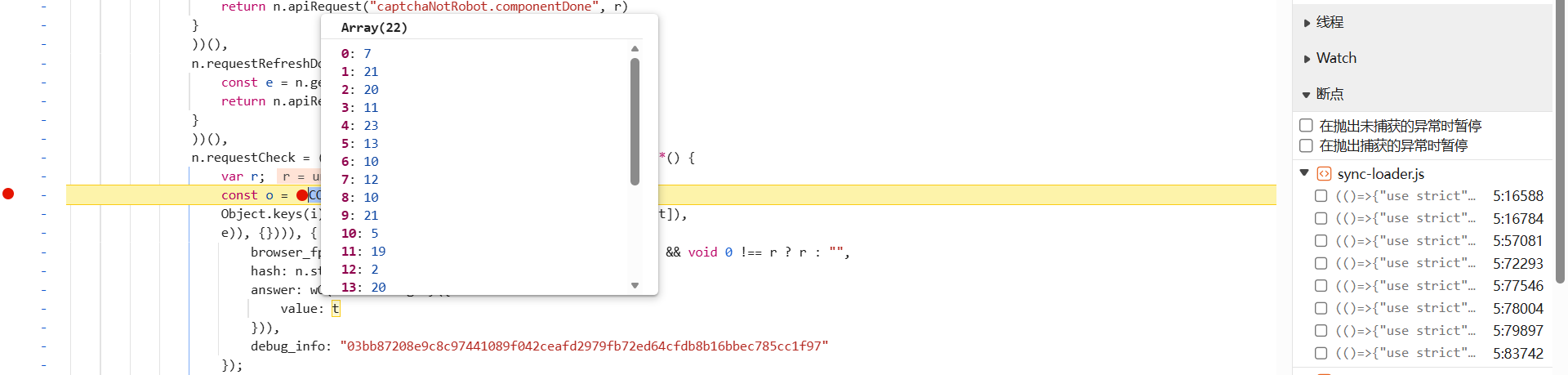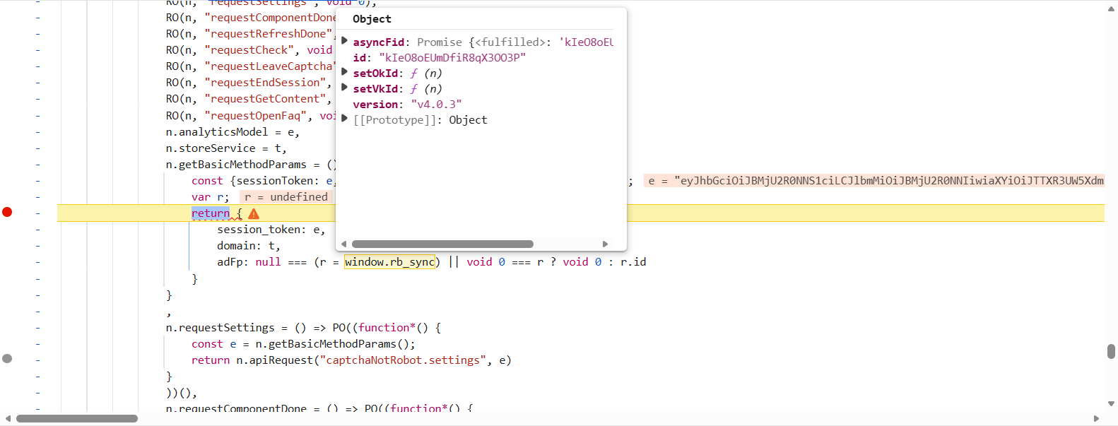adFp 是获取背景图片链接接口的加密参数,从该接口的堆栈跟到 not_robot_captcha.js 文件中,ctrl + s 局部搜索下 adFp,发现就一个位置,下断后重新获取验证图片即会断住。如下图所示,此时 window.rb_sync 中 adFp 的值已经生成了: