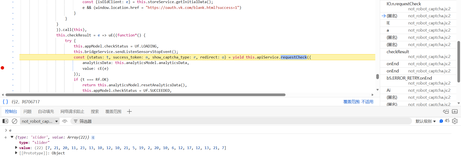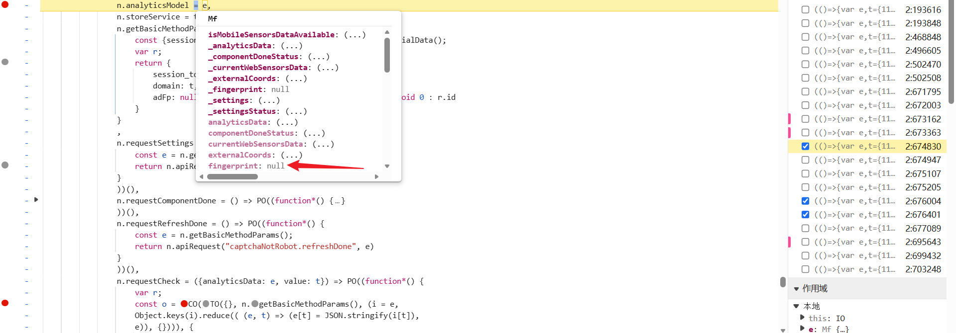 从验证接口 captchaNotRobot.check 跟到 not_robot_captcha.js 文件中,搜索后发现仅有两处,都打上断点,刷新网页断住,n.analyticsModel.fingerprint 即 browser_fp 参数的值: