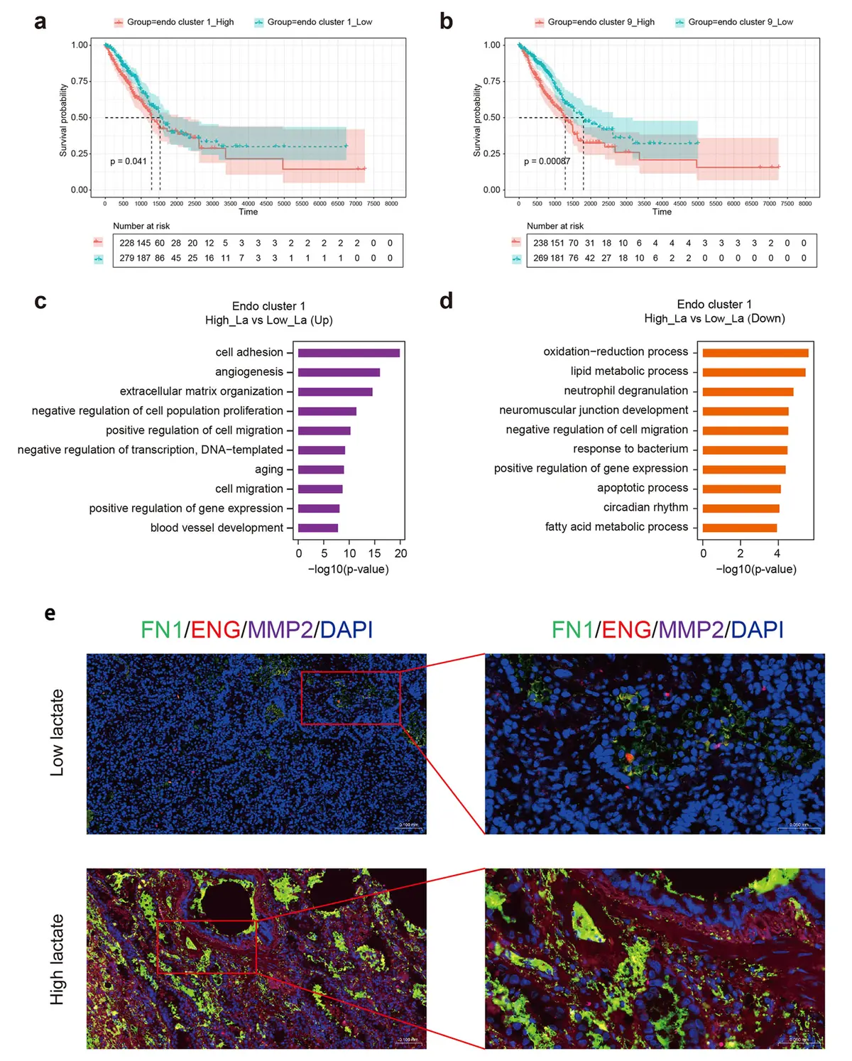 多重免疫荧光染色进一步证实,高乳酸样本中内皮细胞(标记物FN1)及血管结构(ENG/MMP2)显著增多,提示乳酸积累驱动促血管生成内皮亚群扩增,进而促进肿瘤进展与不良预后。