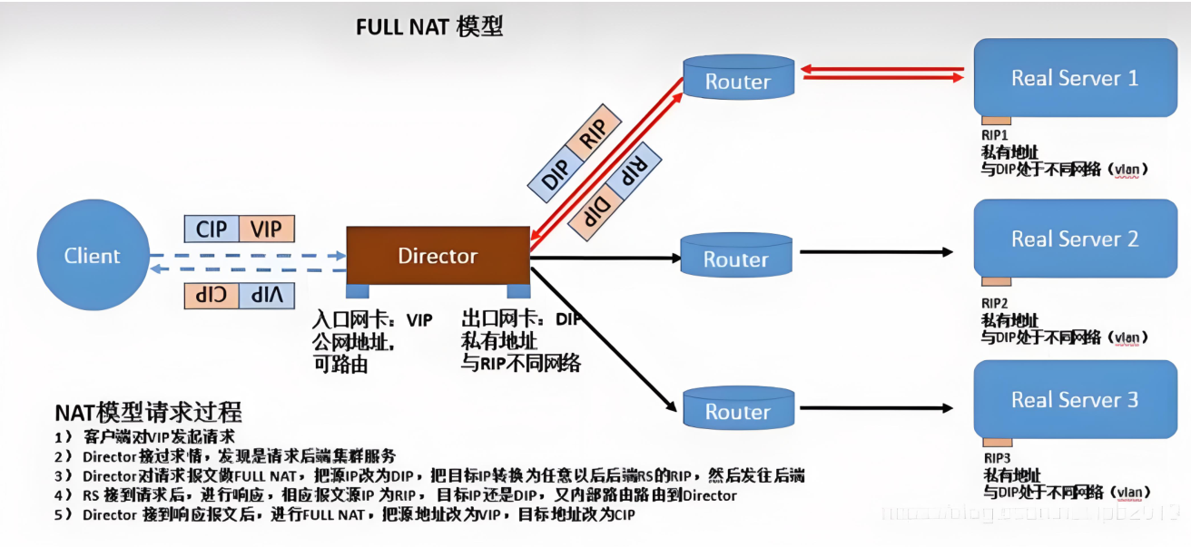 - LVS-Fullnat:RIP和DIP未必在同一网络,但要能通信