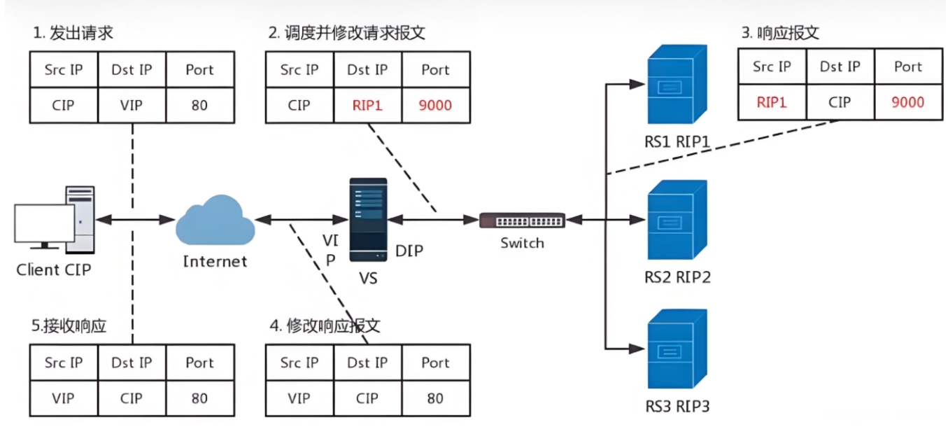 本质是多目标IP的DNAT,修改请求报文中的目标地址和目标端口修改为挑出的RS的RIP和PORT实现转发