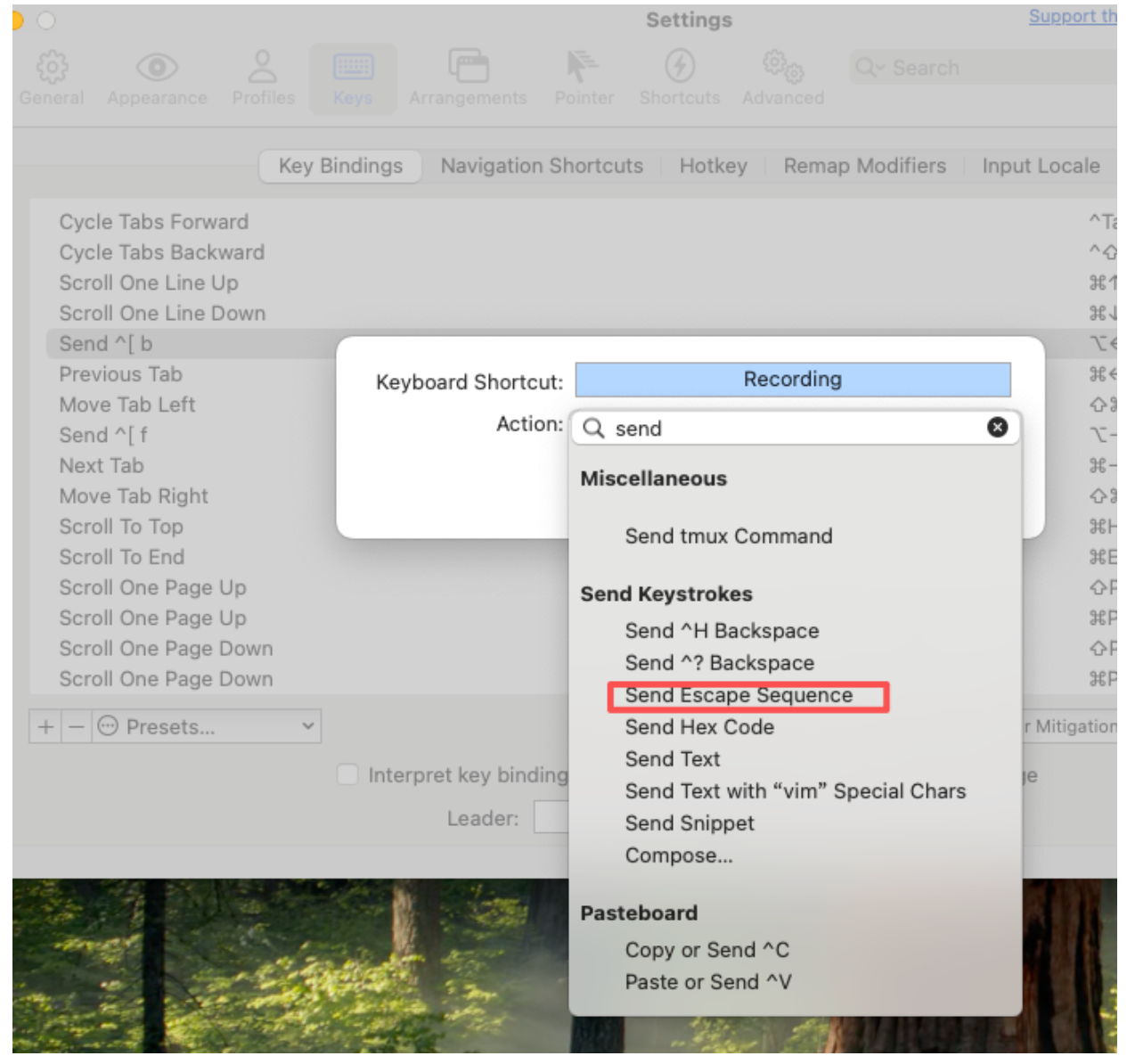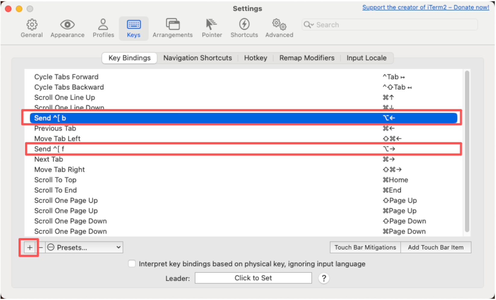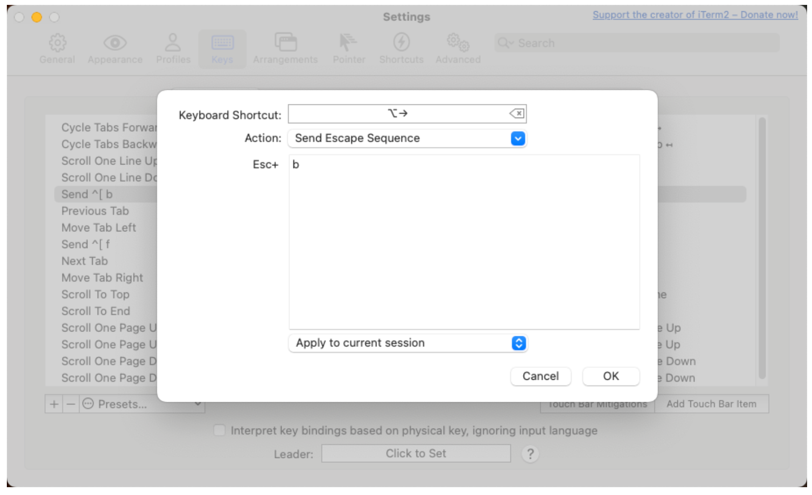 分别修改option+←和option+→的映射如下图所示,选择Action为"Send Escape Sequence",然后输入"b"和"f"即可。