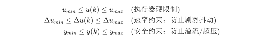 PID 遇到执行器饱和(如阀门全开)时,容易出现积分饱和(Integral Windup) 。而 MPC 将约束直接写进优化问题: