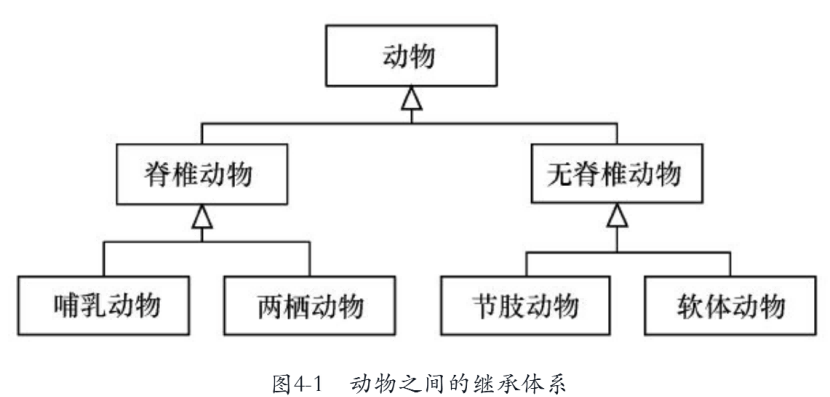 所谓继承,就是从"先辈"处获得特性,它是客观世界事物之间的一种重要关系。例如,脊椎动物和无脊椎动物都属于动物,在程序中便可以描述为:脊椎动物和无脊椎动物继承自动物;同时,哺乳动物和两栖动物继承自脊椎动物,而节肢动物和软体动物继承自无脊椎动物。这些动物之间会形成一个继承体系,如下图4-1所示。