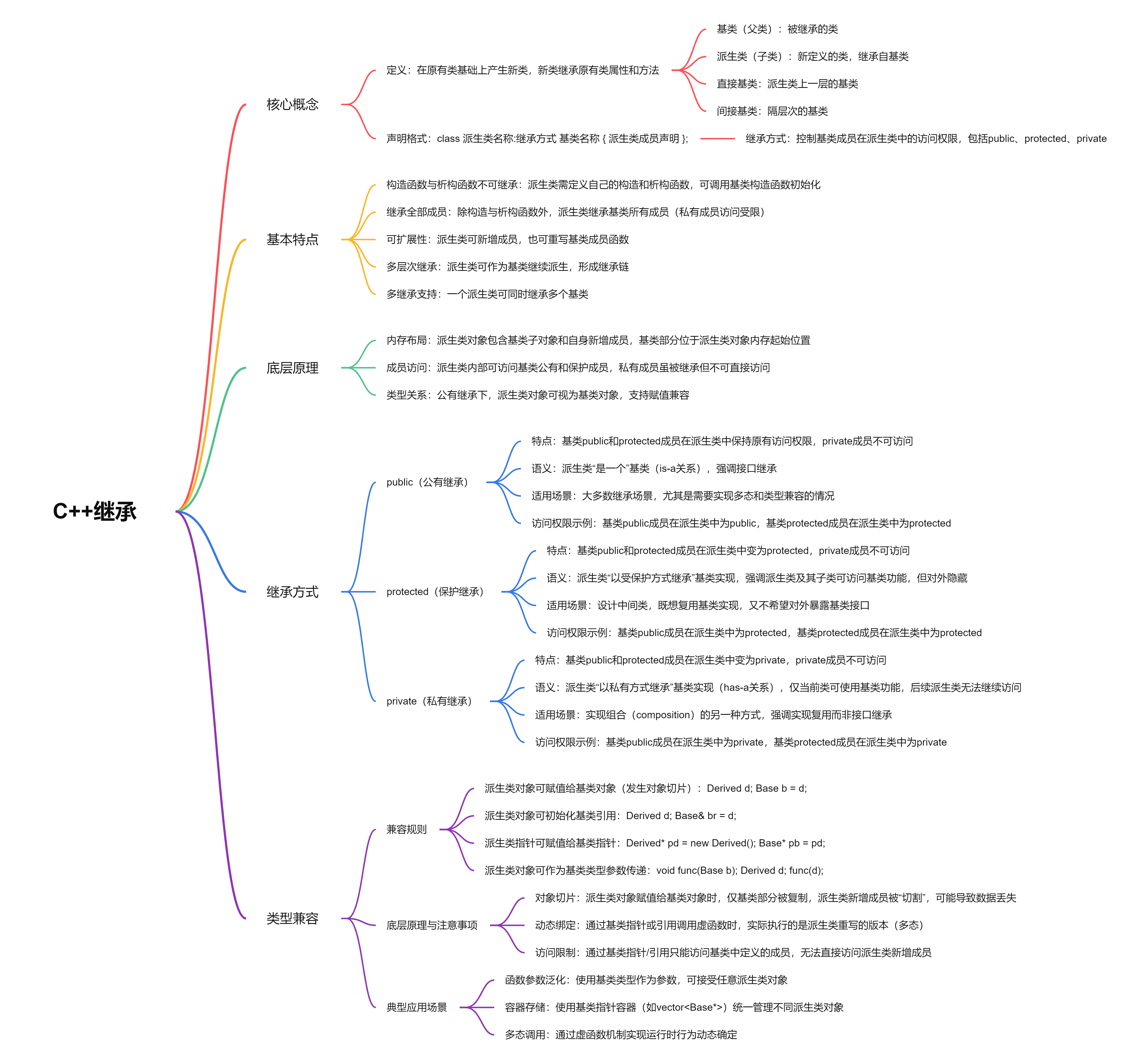 - 成员访问:通过继承,派生类内部可访问基类的公有和保护成员,私有成员虽被继承但不可直接访问(成为"不可访问成员")。
