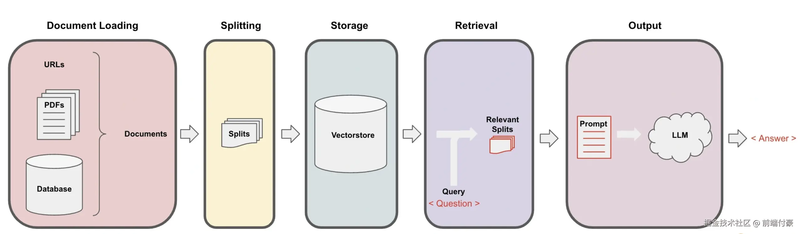 上面5个环节的介绍都非常简单,有些概念(如嵌入、向量存储)是第一次出现,理解起来需要一些背景知识,别着急,我们接下来具体讲解这5步